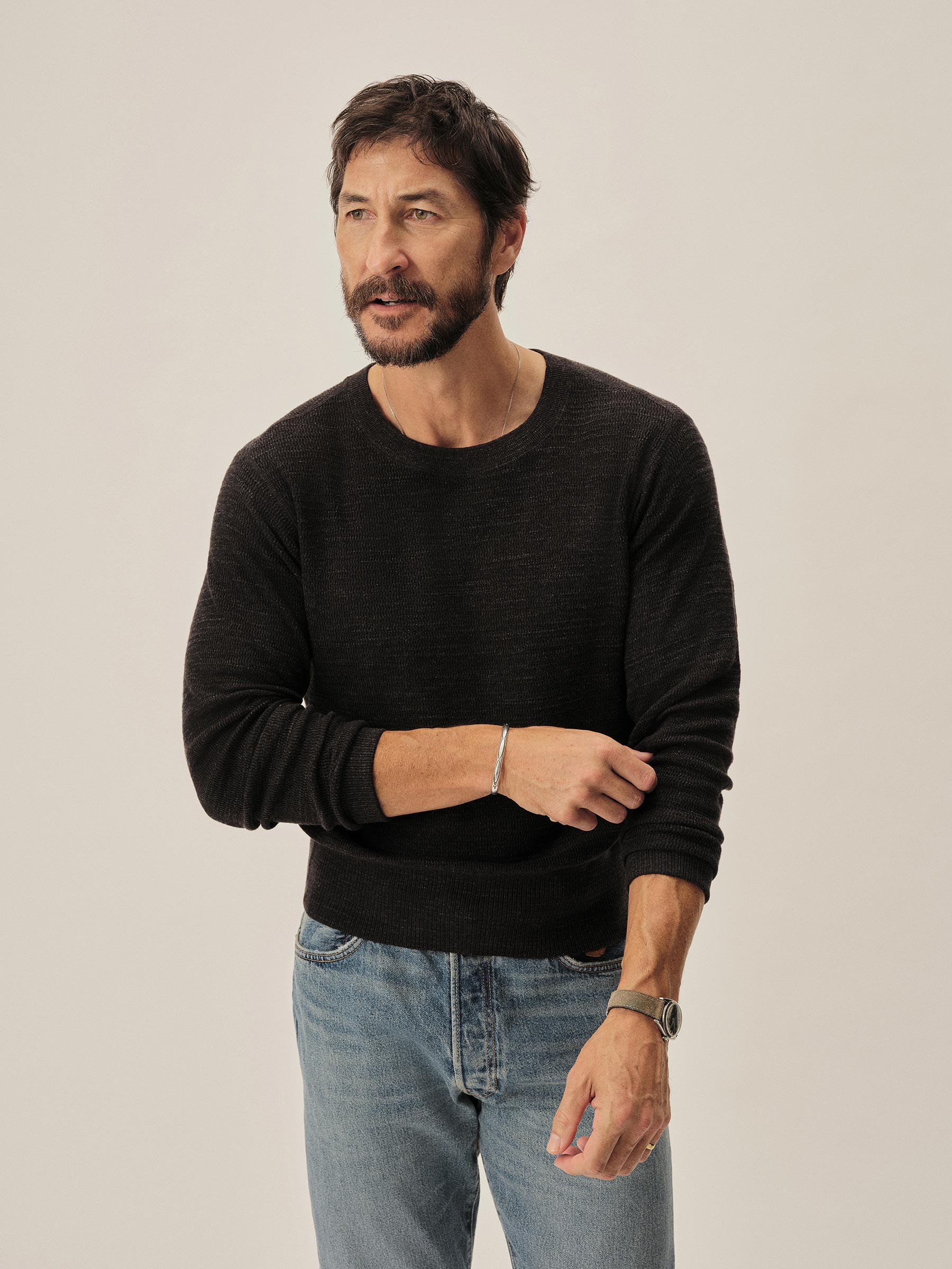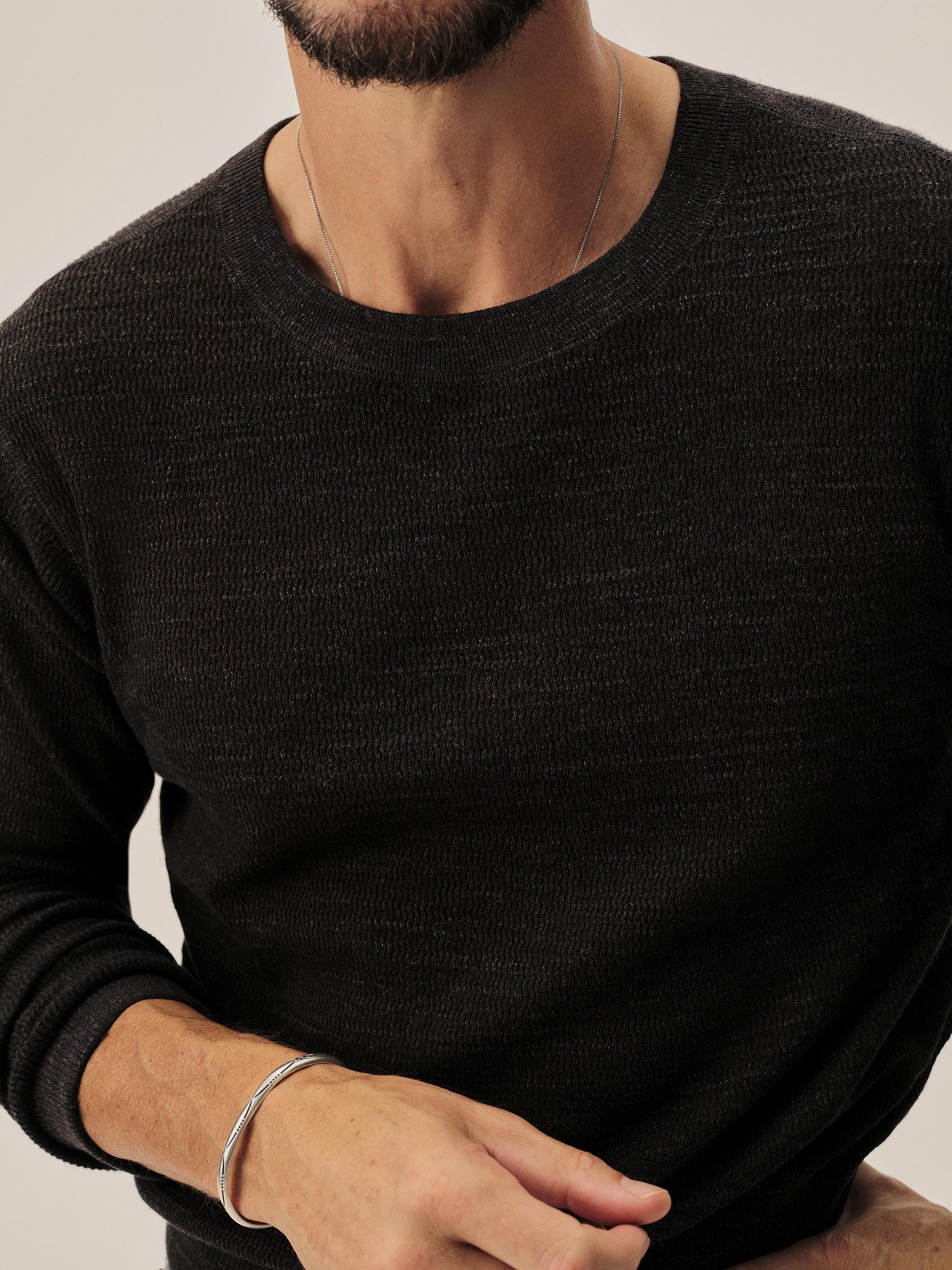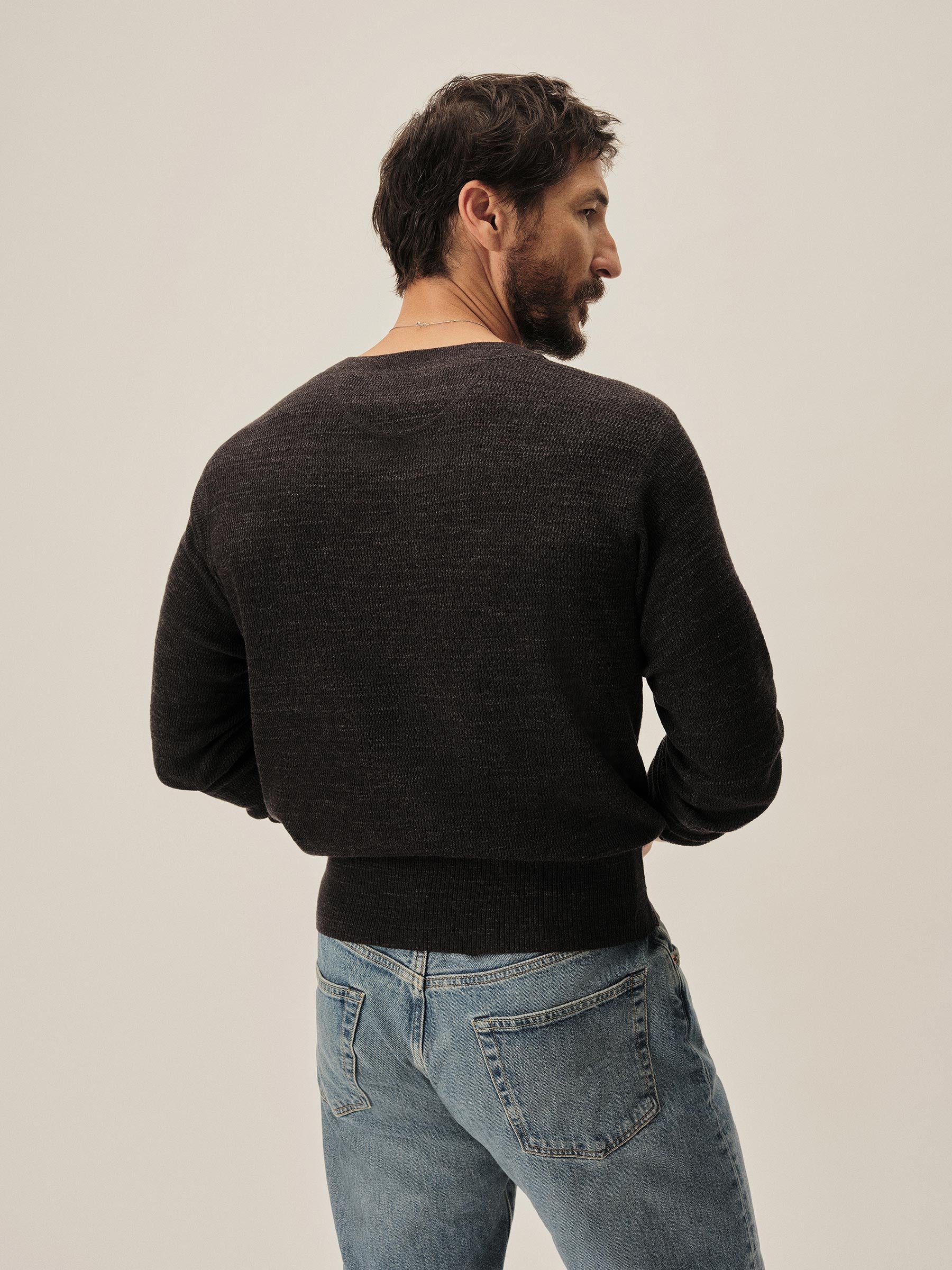 Inspired by WWII-era cut-and-sew thermals, this lightweight crew is knit from 100% slub cotton in a thermal stitch for breathable texture and vintage character. It’s finished with ribbing at the neck, cuffs, and hem, and yarn-dyed and garment-rinsed for a soft hand and broken-in feel.