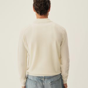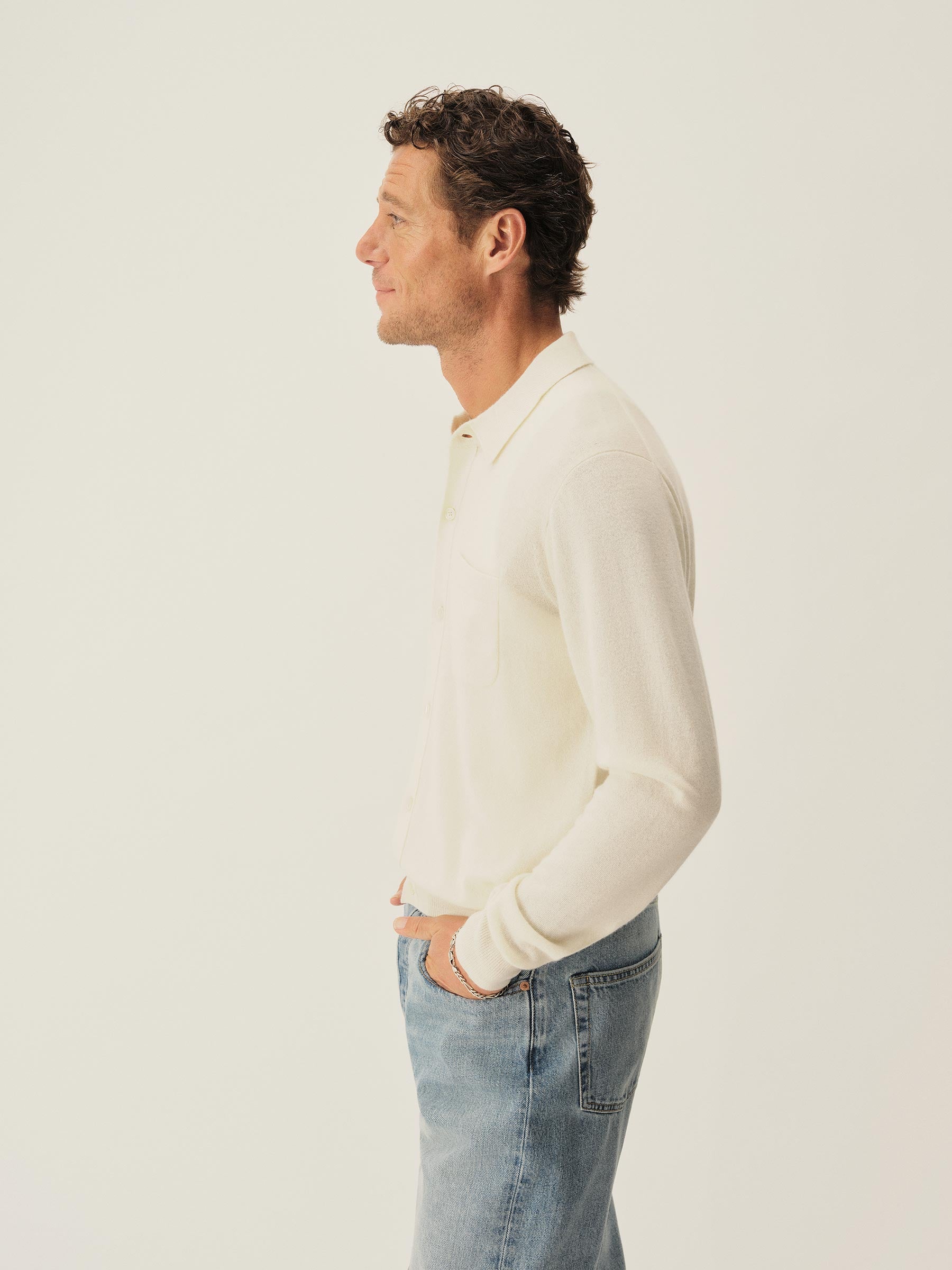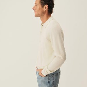 Classic fit long sleeve button-front sweater in a 12 gauge jersey knit from yarn-dyed long staple cashmere. Details include a three-button placket with shell buttons and ribbing at the cuffs and hem. Constructed with hand-linked seams for durability.