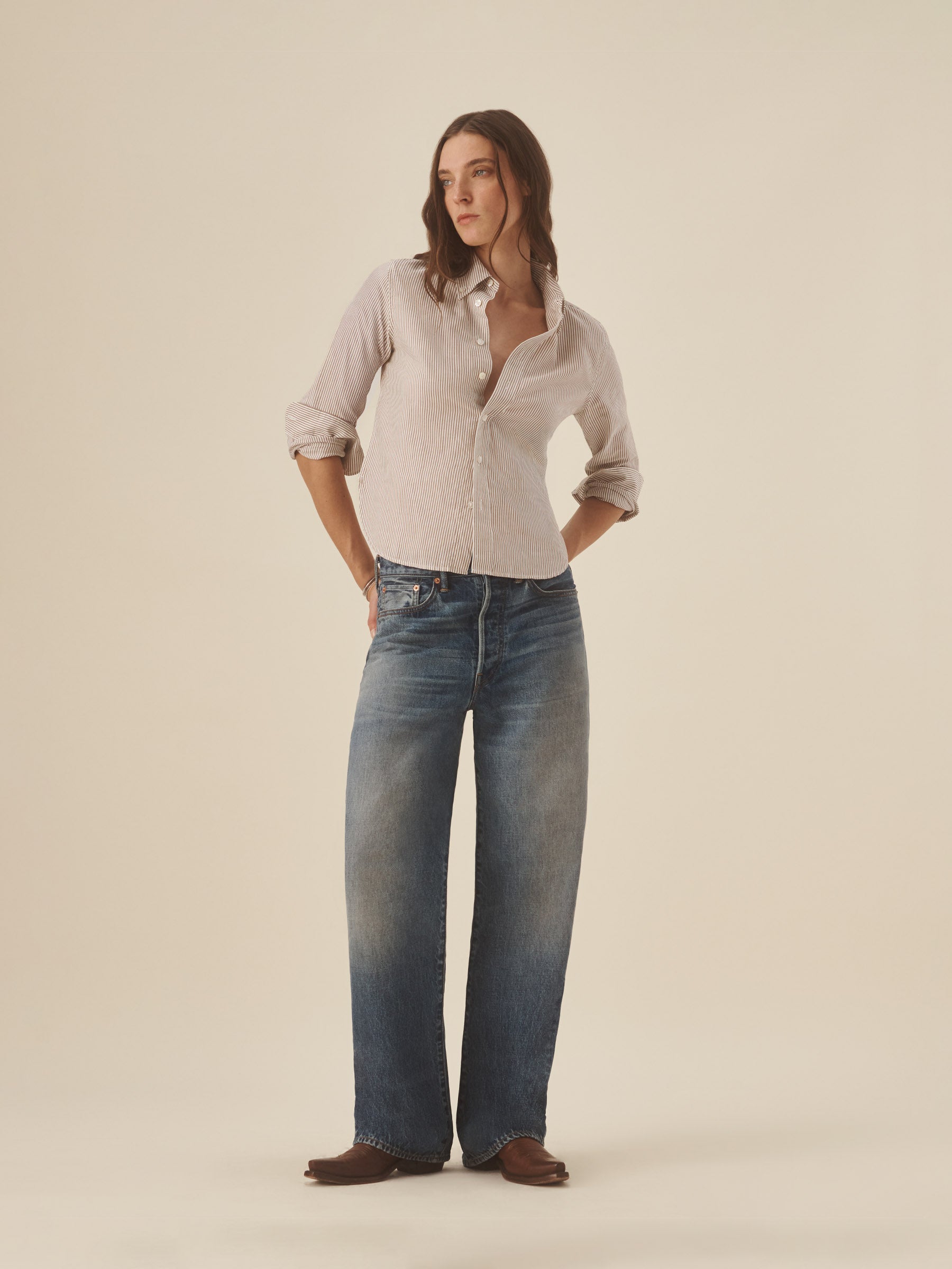 Inspired by 1950s men’s dress shirts, an Oxford cut from a natural, yarn-dyed fiber blend with a soft hand and crisp structure. Our slimmest shirt yet, it’s designed with a button-down collar that holds the perfect roll, stacked mother-of-pearl buttons, and felled seams for durability. Details include knife pleats at the cuff, a box pleat at the back yoke, and a shrunken silhouette made to layer under a blazer or wear solo.