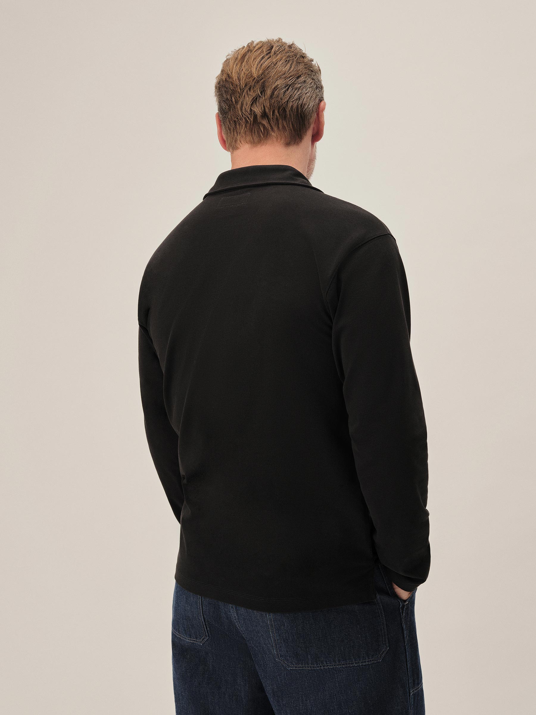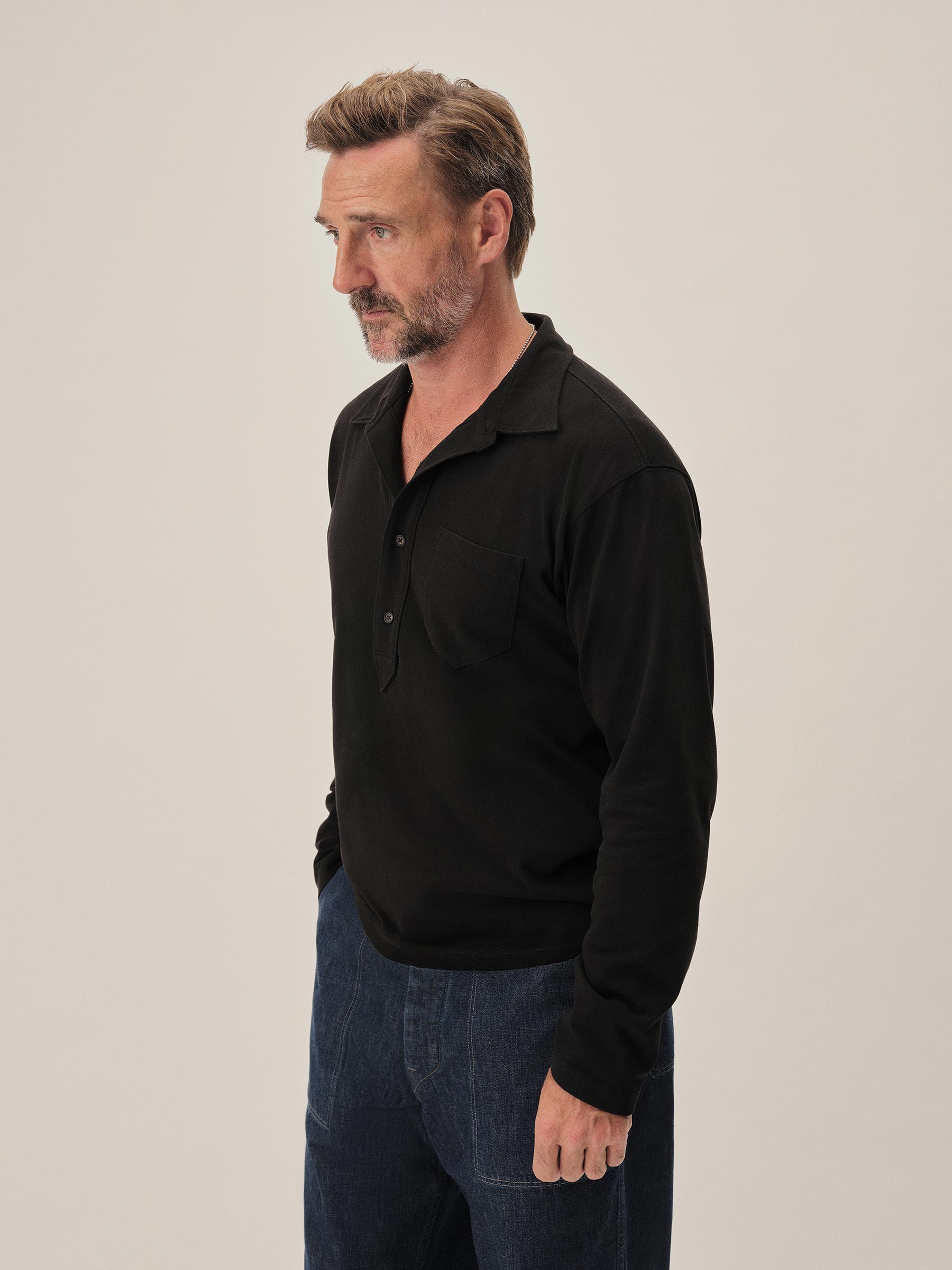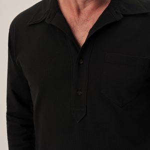 A popover shirt made from a midweight compact cotton jersey with a smooth, uniform texture and cool hand. It features a traditional shirt collar with a four-button half placket and single chest pocket. Ribbed sleeve cuffs.