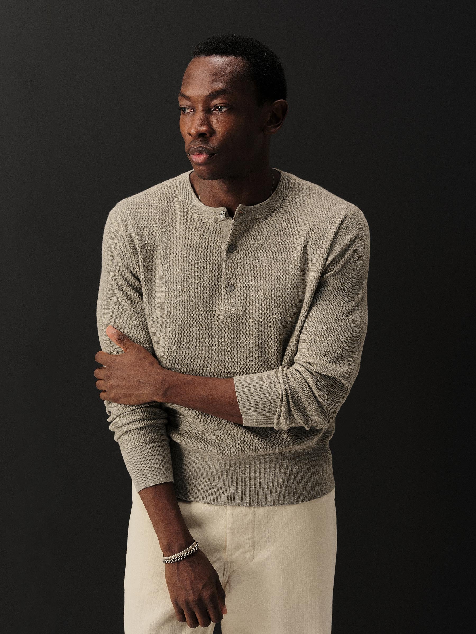 A standard fit, vintage-inspired thermal stitch henley crafted from slubby, yarn-dyed cotton. Featuring variegated rib finishes at the cuffs and bottom hem, and coverstitching along the seams. Finished with a three button shell closure.