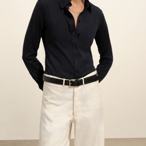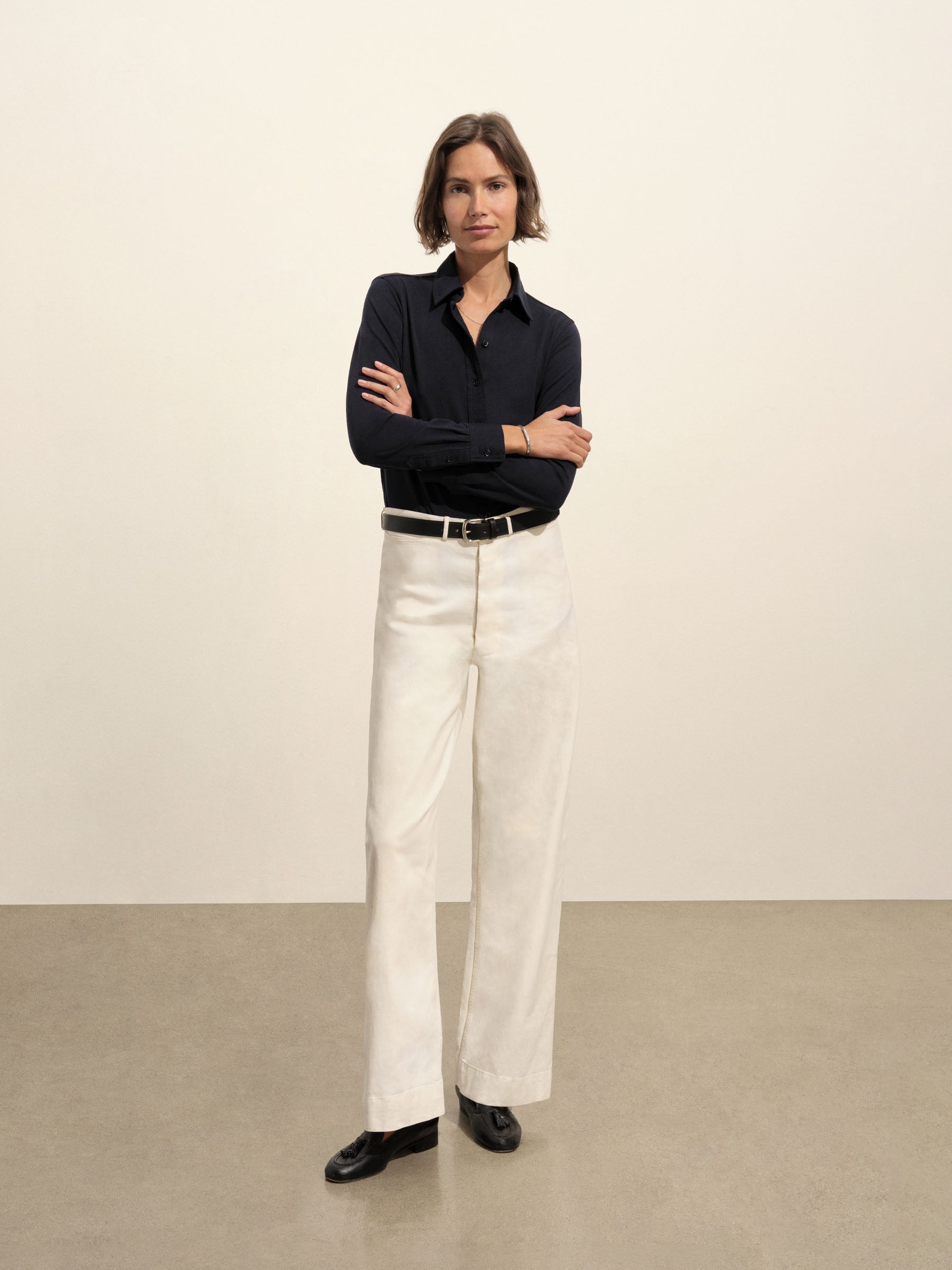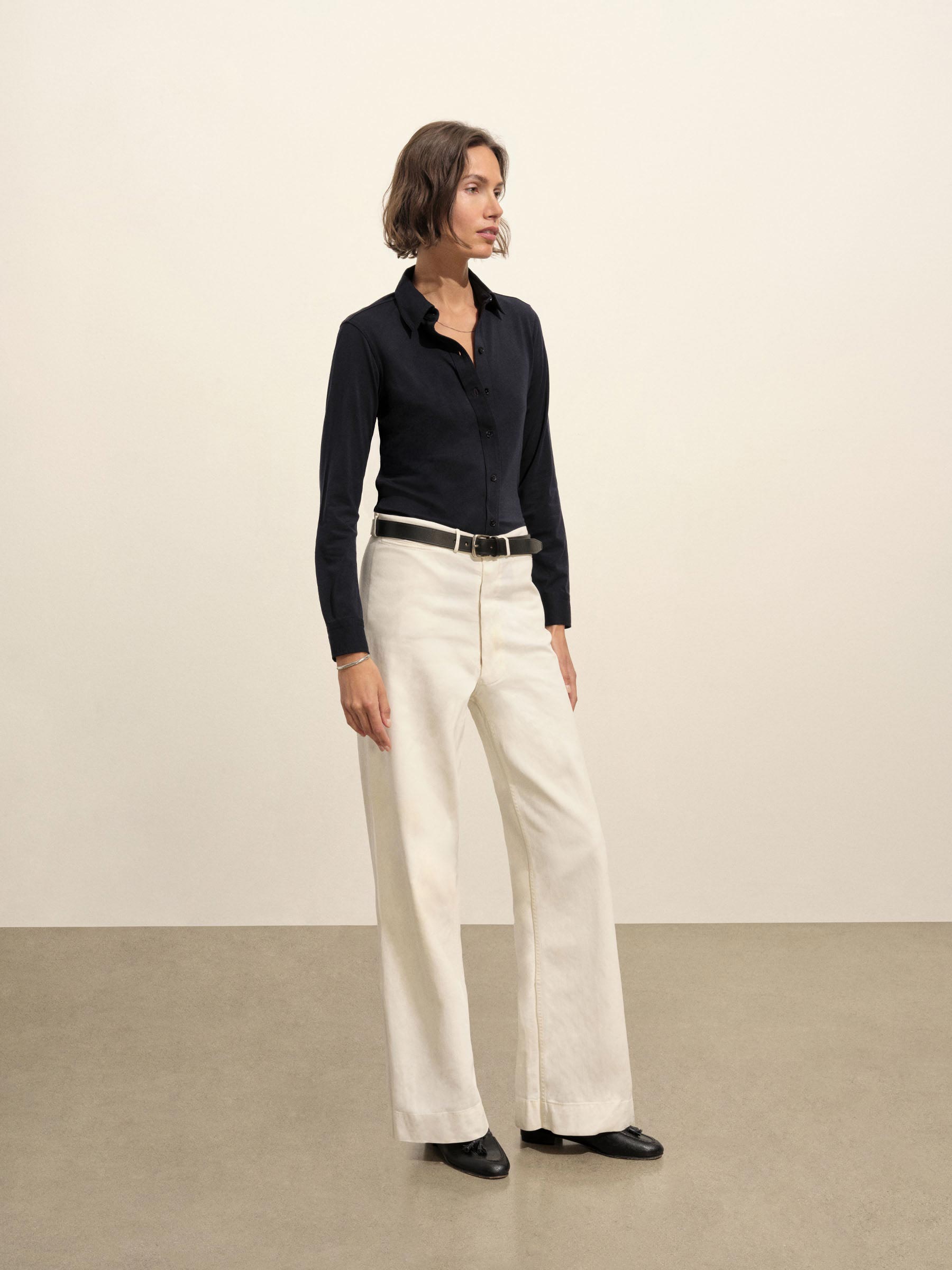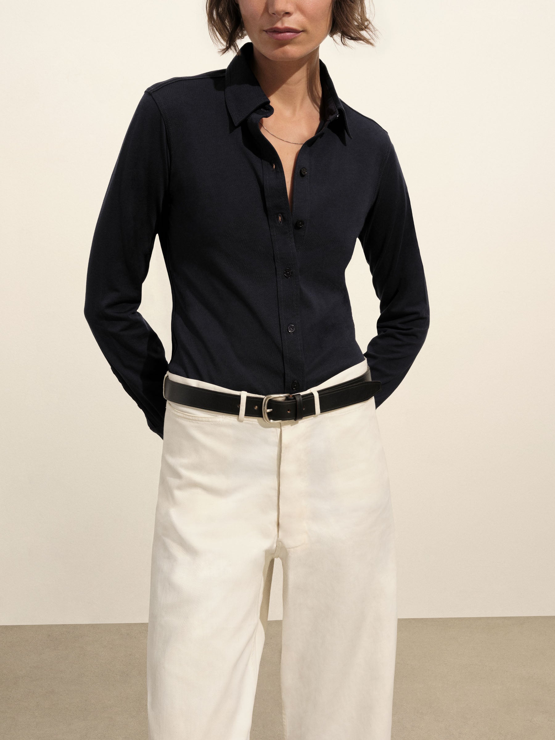 Silky, relaxed slim-fit jersey-knit button-down crafted from a blend of EcoCell and Pima cotton, featuring a collar backed with combo jersey and buttoned sleeve openings. Garment washed for an authentic vintage hand feel and finished with mother of pearl buttons.