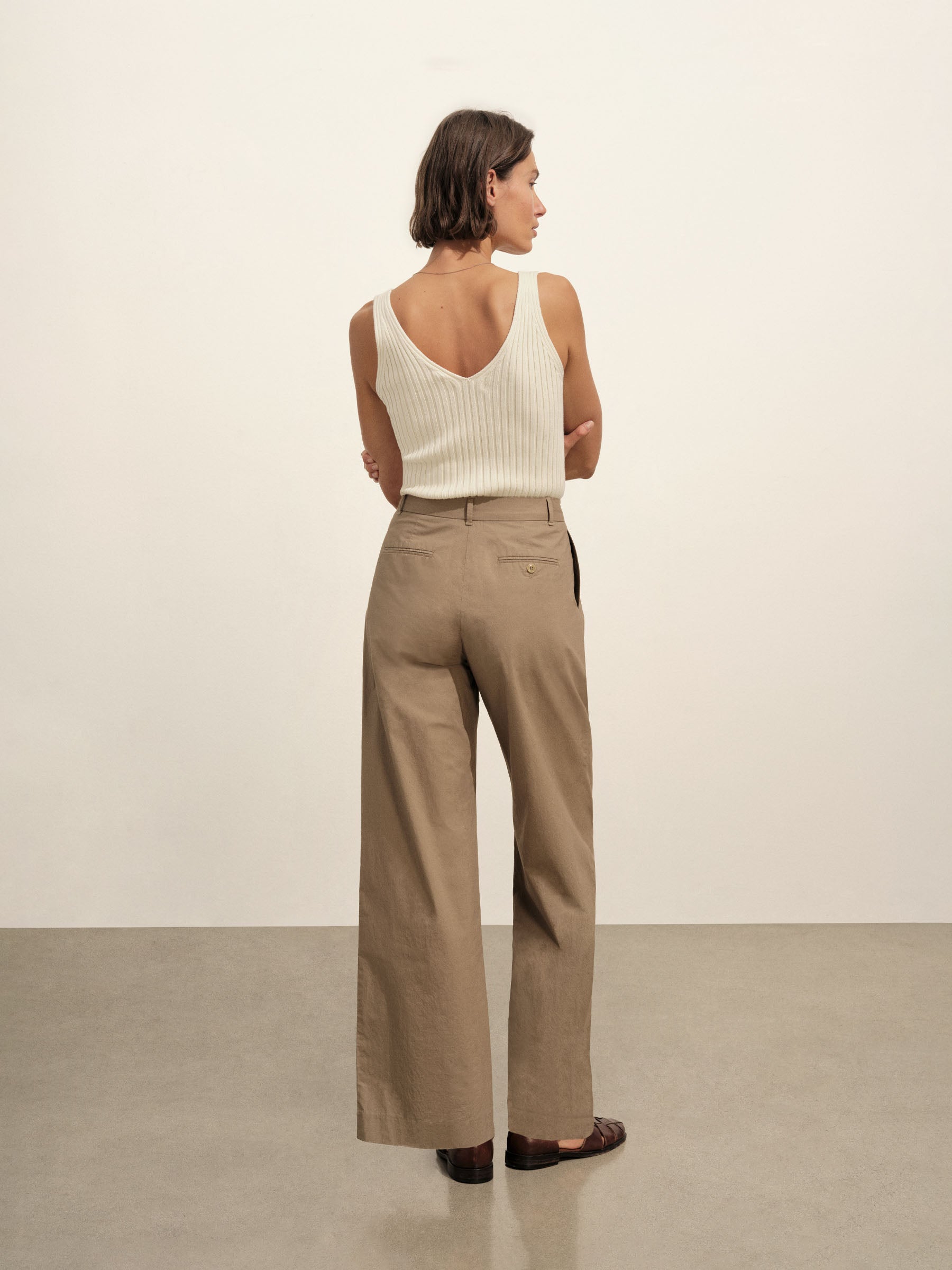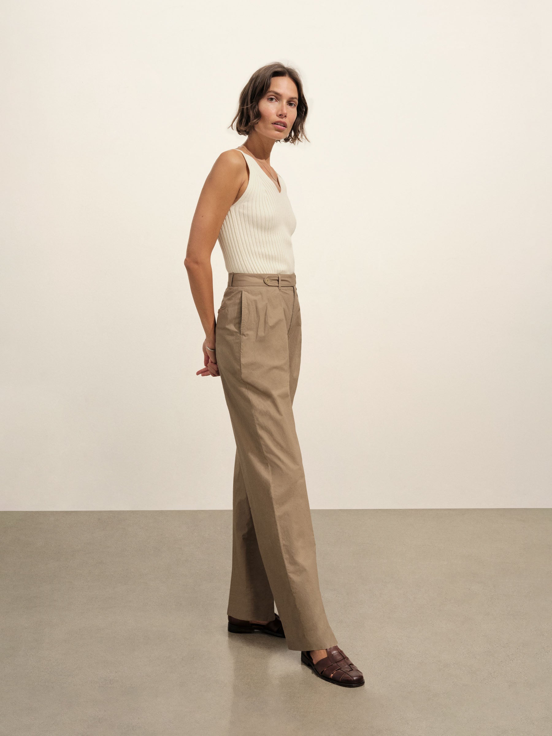 Slim-fit, vintage-inspired V-neck tank crafted from 100% Italian cotton yarn with a 3×3 deep rib structure. Designed with concealed chain threads and snaps beneath each shoulder to keep bra straps in place. Garment washed for a truly vintage, broken-in feel.