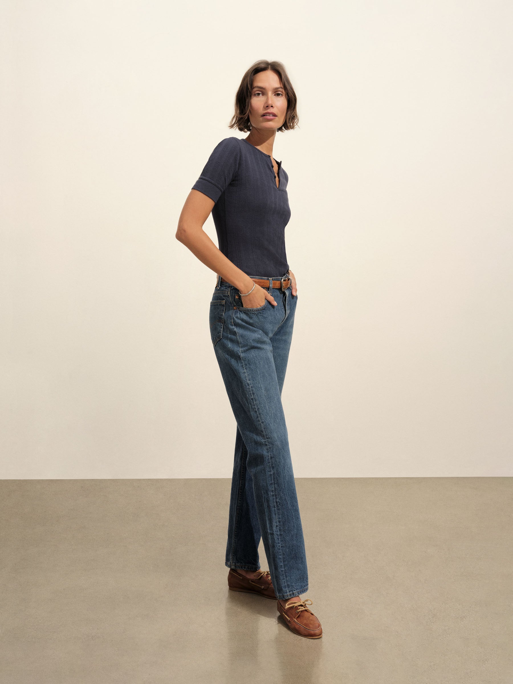 Military-inspired short sleeve henley, crafted from a superfine blend of new and recycled cotton with a subtle, textured rib. Featuring a three-button loop placket and sleeve cuffs. Finished with mother of pearl buttons and garment washed for a lived-in feel.