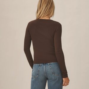 “Slim fit long sleeve henley cut from extra fine 170 GSM cotton with recycled content that holds its shape. Details include a a three-button loop placket with corozo fish eye buttons, and straight, clean finished hem and cuffs. Garment washed for a lived-in feel.
