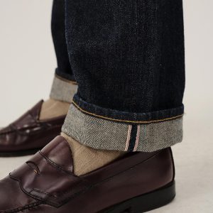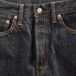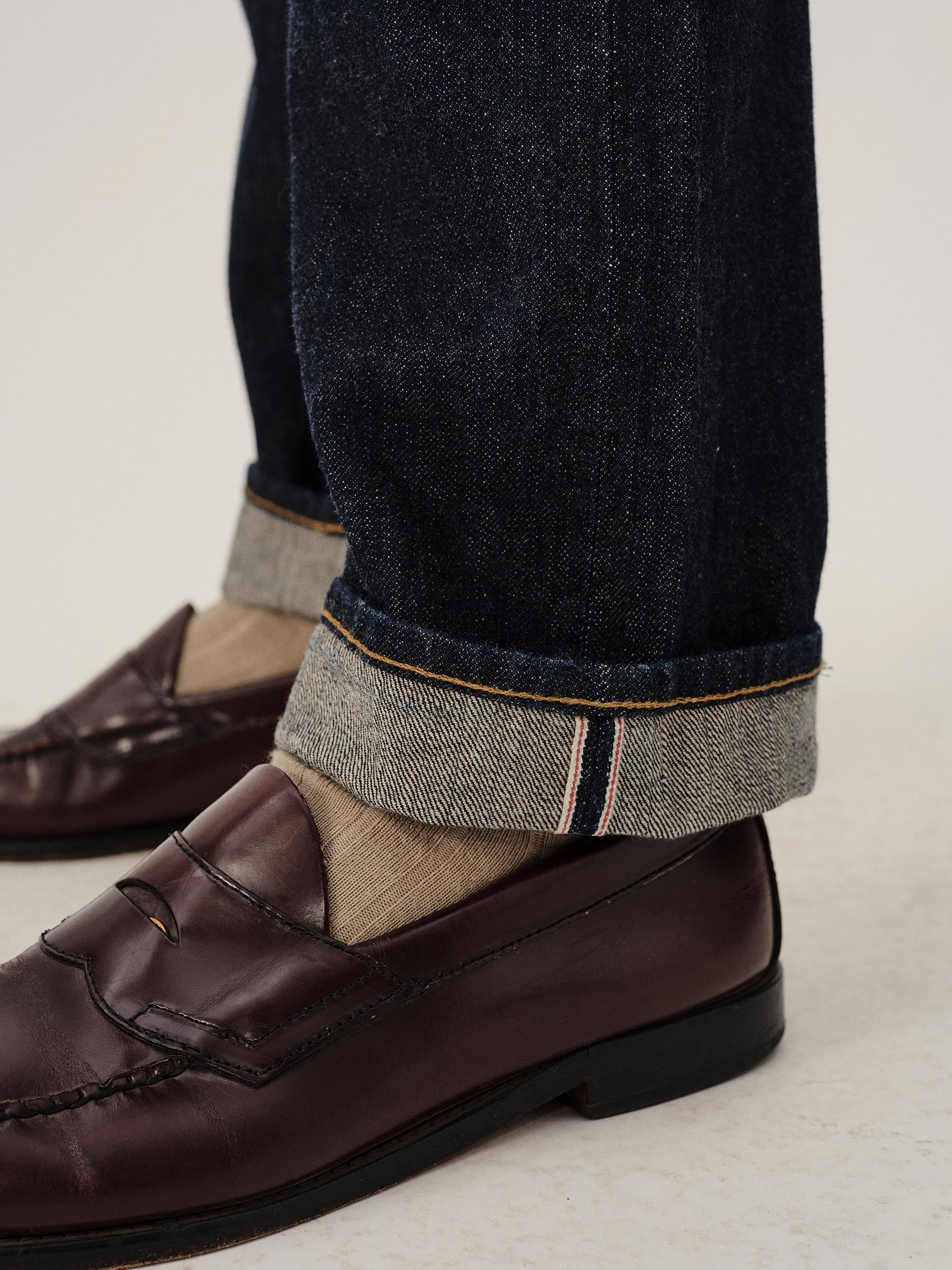 A classic 5-pocket jean in our Ford Standard fit: mid-rise, straight through the thigh with a taper below the knee. Inspired by blue jeans from the 1940s through the 1960s, this shuttle loomed 14 oz. selvedge denim is unsanforized, and has an organic texture that develops more character with every wear. Garment rinsed for a lived-in feel. Details include copper rivets and a metal tack button fly.