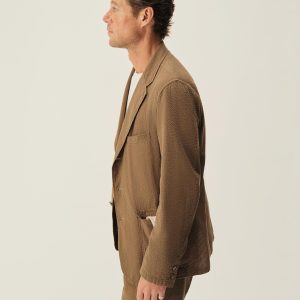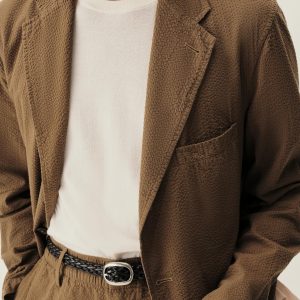 Tailored 3-roll-2 button blazer inspired by timeless vintage suiting. This 5 oz cotton seersucker has a rippled texture that wicks moisture and maintains airflow making it ideal for warmer climates. Details include two patch pockets, two internal welt pockets, and a notched lapel. We left it unlined and omitted the back vent and cuff buttons for a casual, streamlined look. Constructed with hand-linked seams and garment washed with enzymes and softener for a lived-in feel.