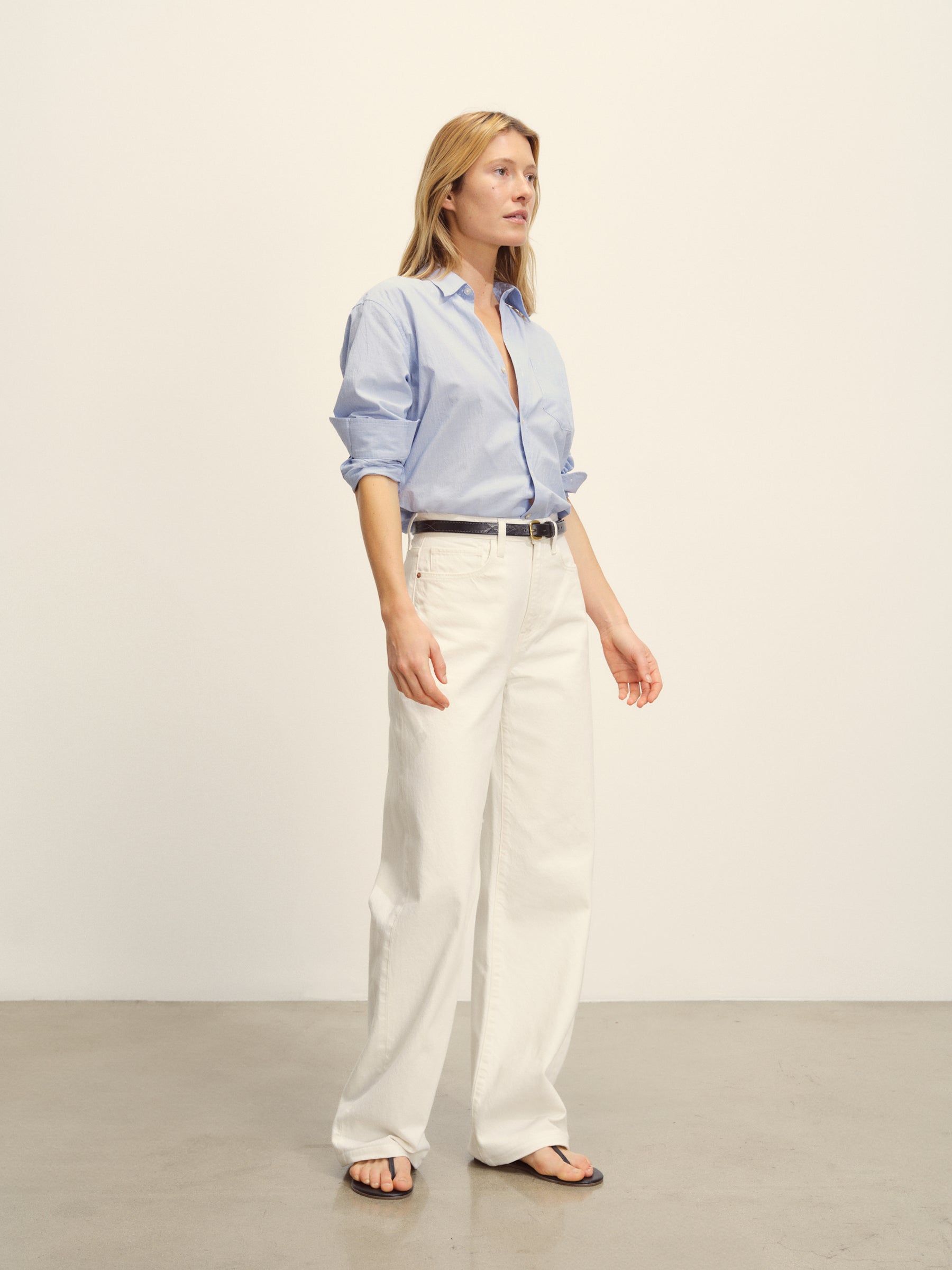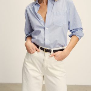 Relaxed button-down shirt in 3.7 oz. cotton plainweave. 29.5” length hits just below the hip. Details include a back yoke with box pleat, a single spade pocket, and pleated cuffs. Inspired by mid-century men’s shirting, this piece can be worn on its own, layered over a tee, or paired with our Rider Pant. Garment washed with softener for a lived-in feel.