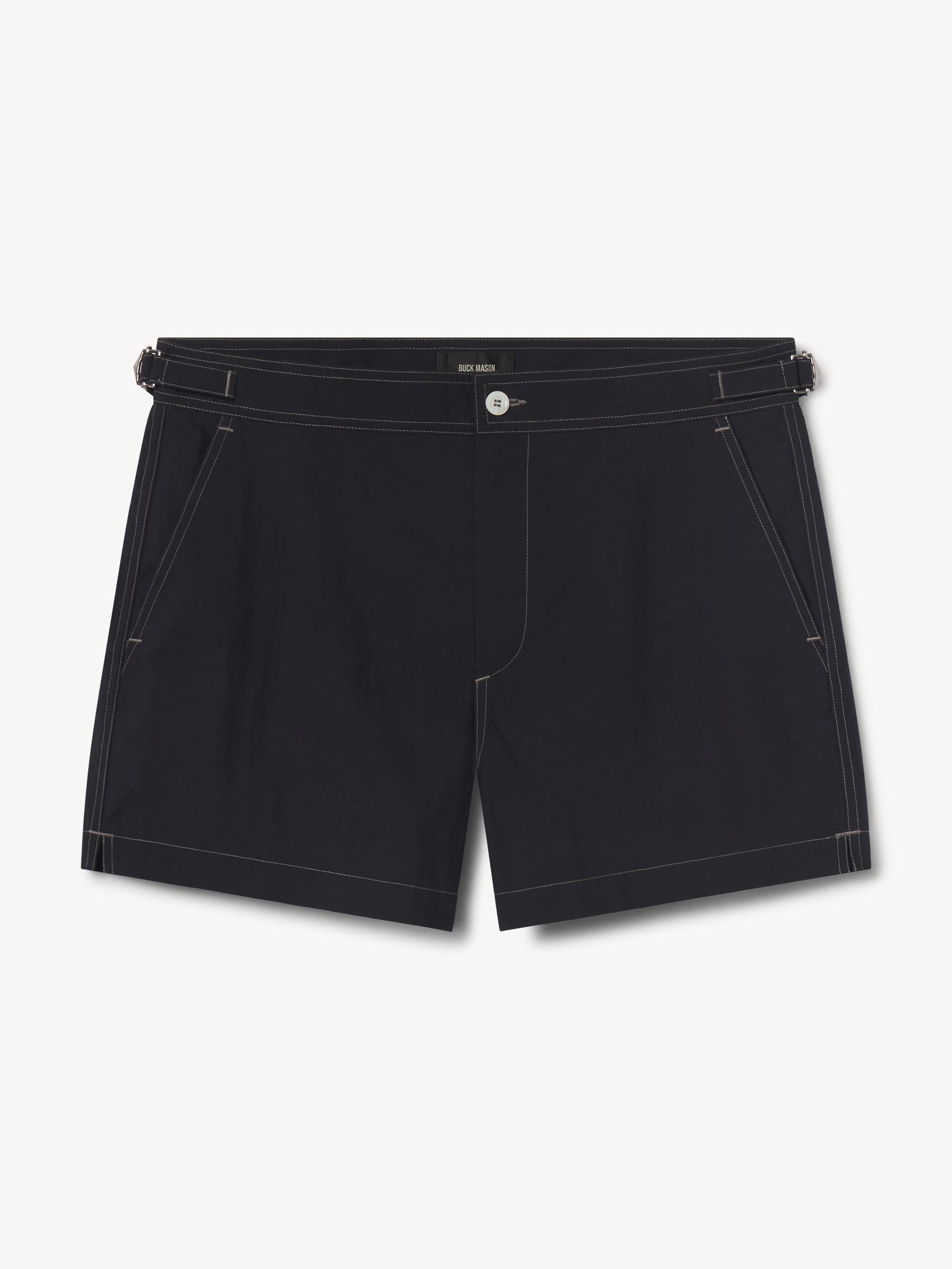 A classic-fit resort short made from sturdy nylon twill, cut with a slightly shorter inseam. Featuring a zipper fly, a button closure, waistband adjuster tabs with metal buckles, and a zippered back pocket.