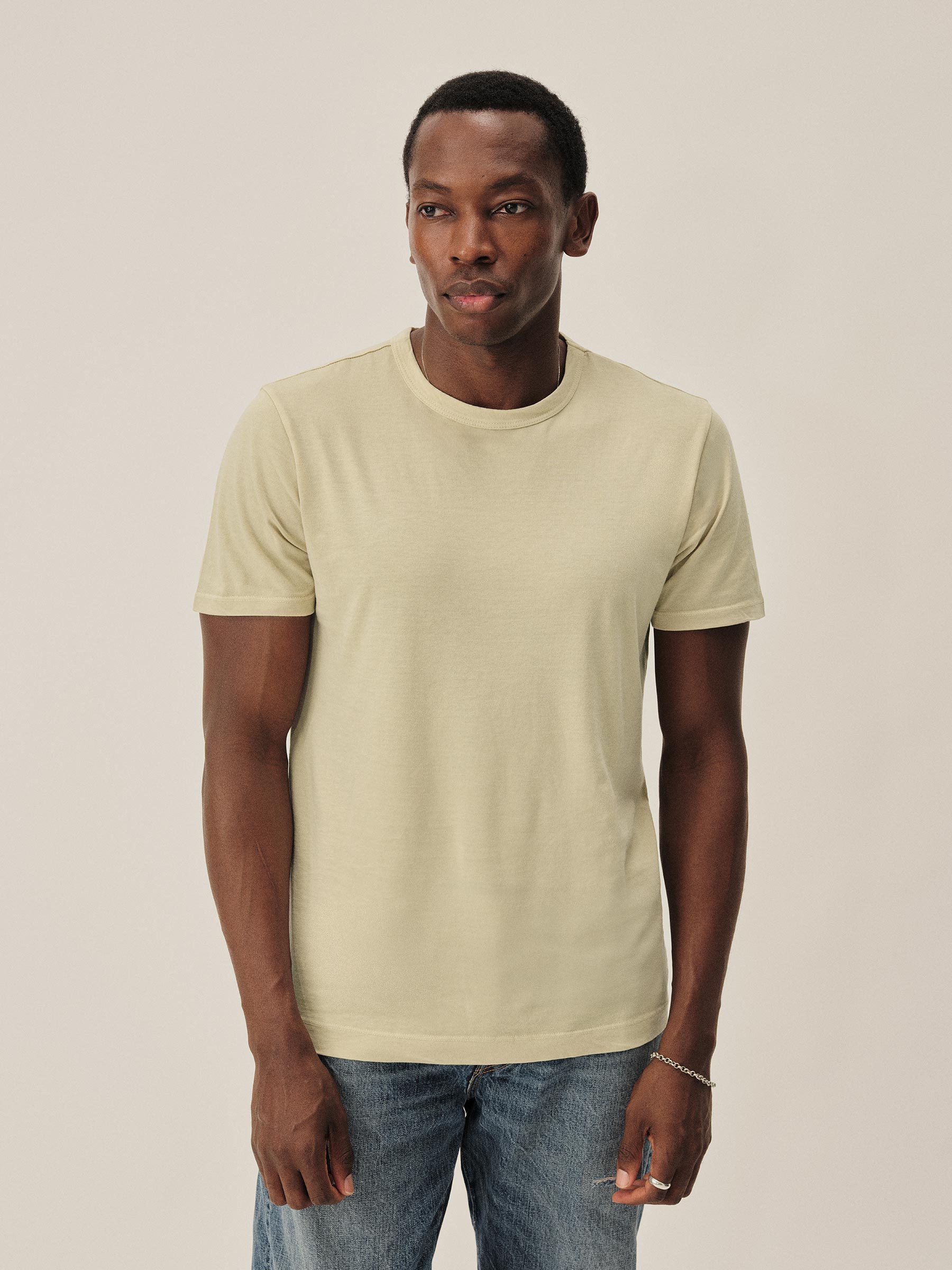 Classic fit short sleeve crewneck with a straight hem. Made at BM Knitting Mills in Mohnton, PA, from USA-grown and milled 140 GSM jersey knit from long-staple Supima cotton with a soft, smooth hand. Garment washed with enzymes and softener for a lived-in feel.