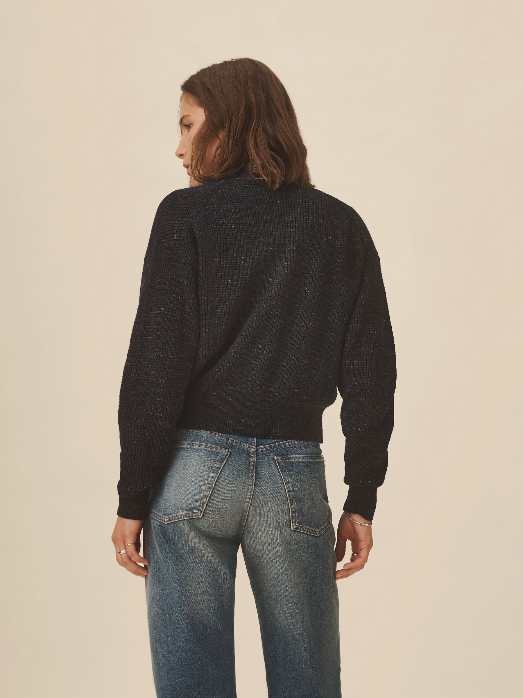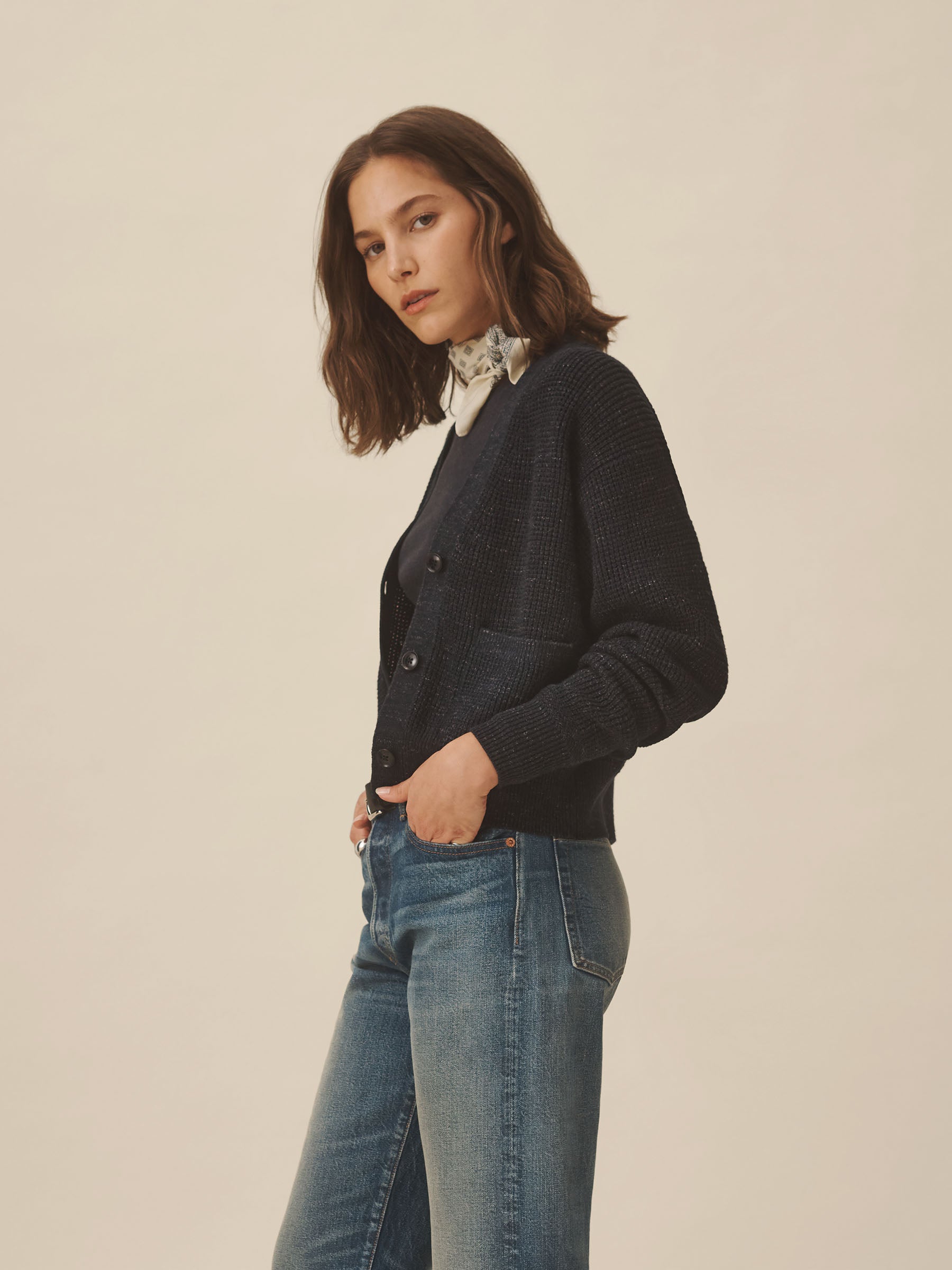 A relaxed cardigan made from marled cotton yarn and knit in a classic waffle stitch. Designed to layer over tees, it’s built with a functional front placket with urea buttons, patch pockets, and a clean V-neckline.