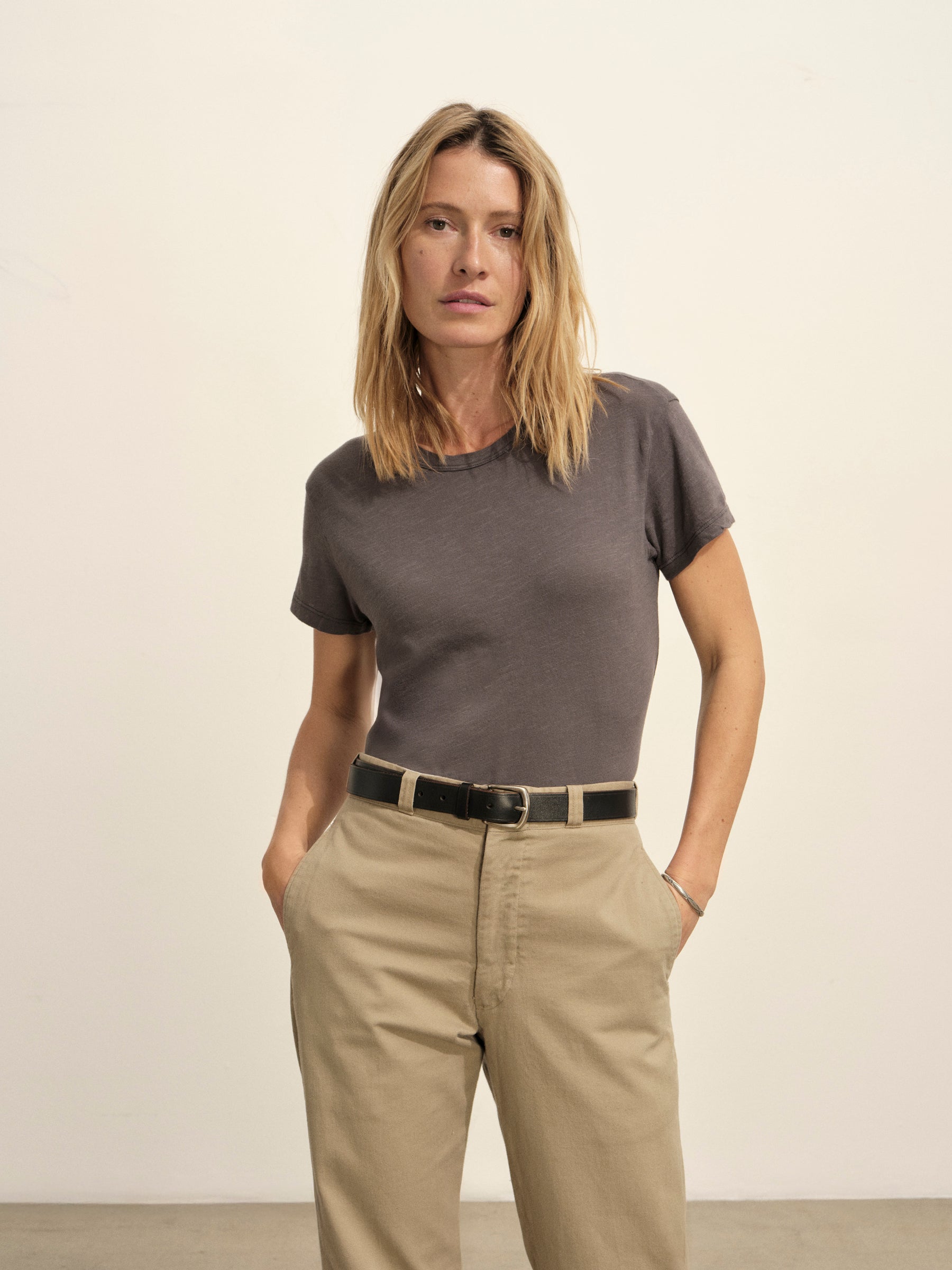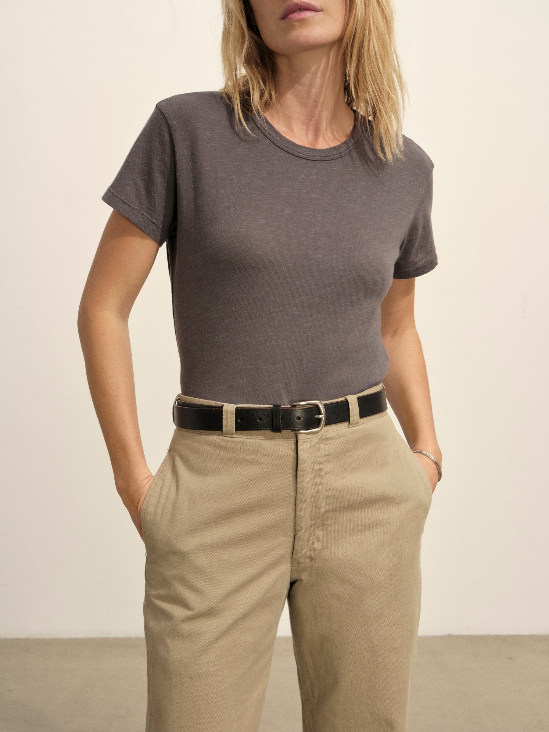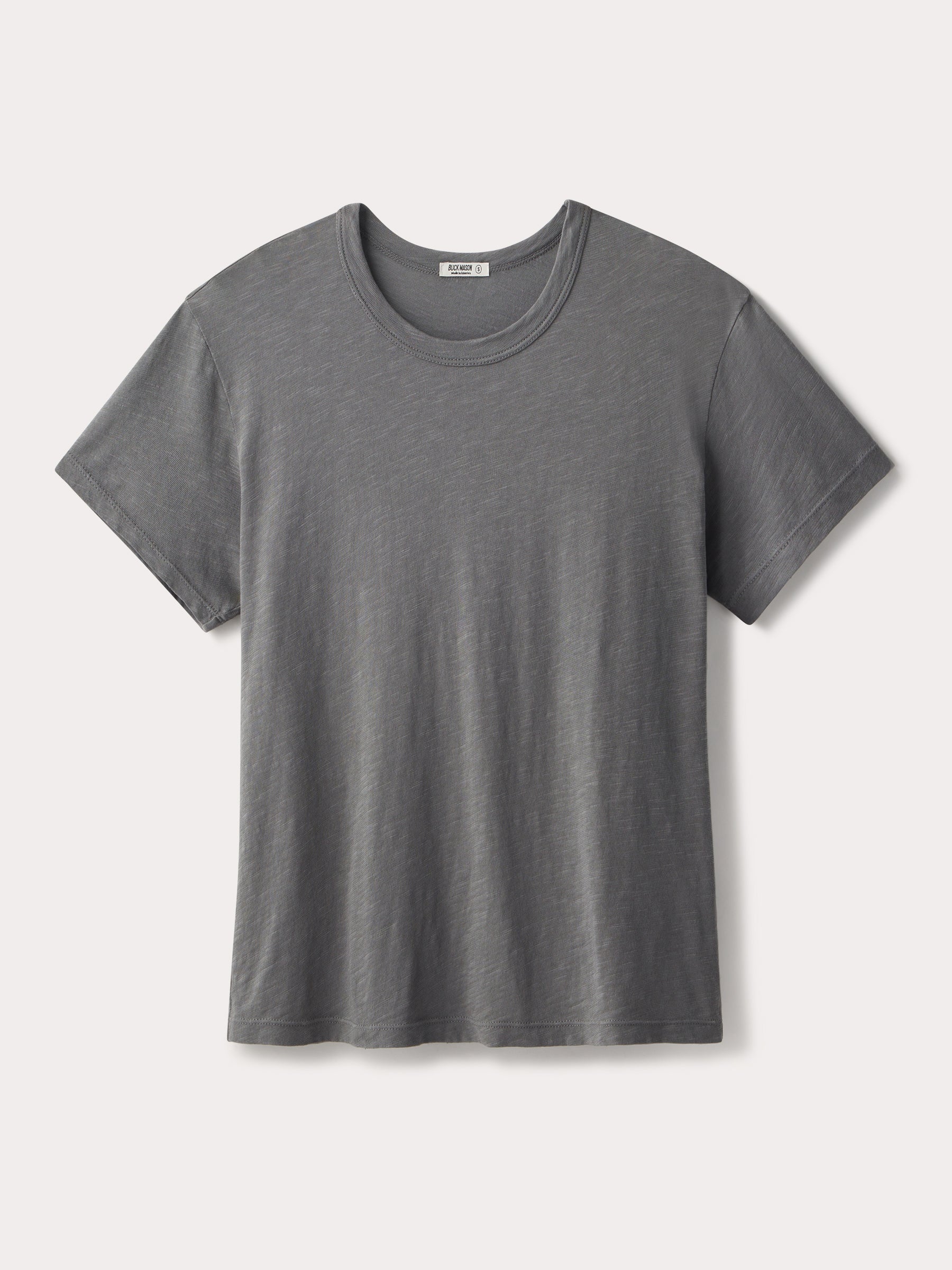 Classic fit short sleeve crewneck tee with a straight hem, cut from 125 GSM cotton with light slub texture. Constructed with self neck binding and ladder stitch detailing at the hems. Garment dyed and washed with softener for a lived in feel.