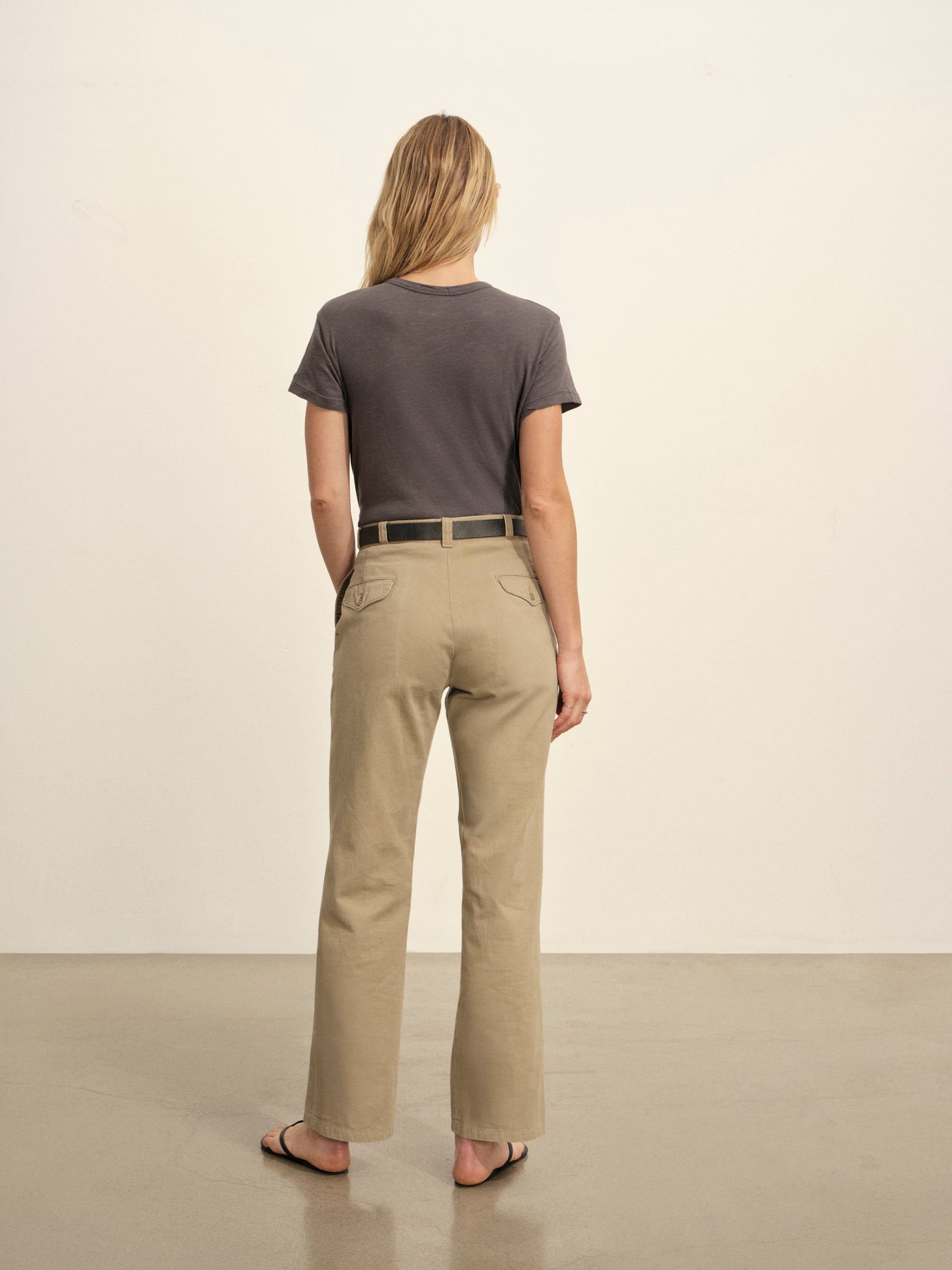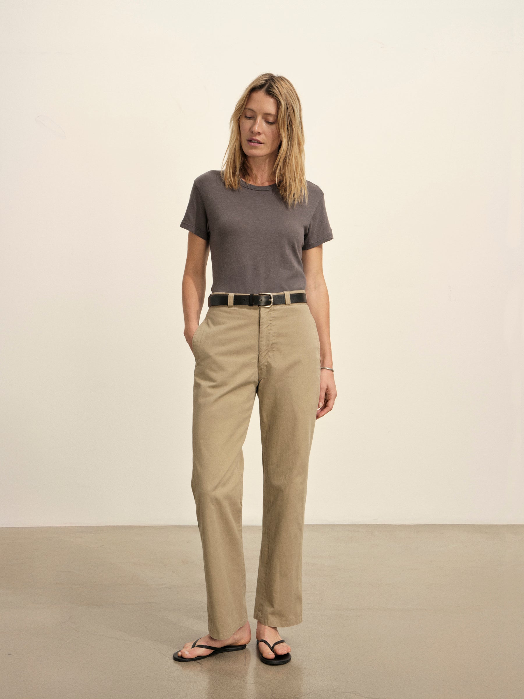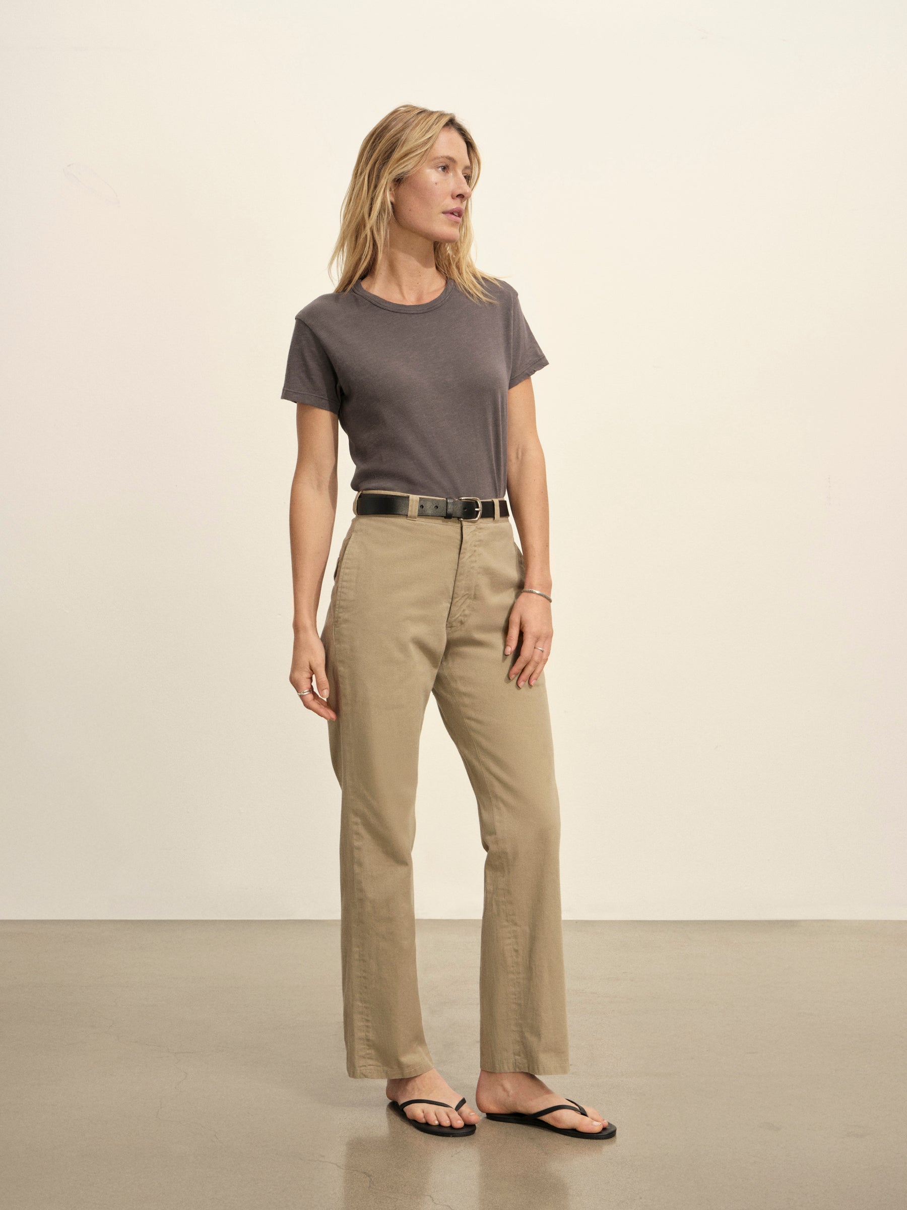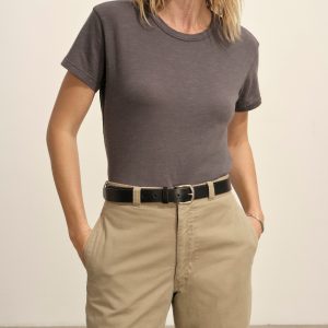 Classic fit short sleeve crewneck tee with a straight hem, cut from 125 GSM cotton with light slub texture. Constructed with self neck binding and ladder stitch detailing at the hems. Garment dyed and washed with softener for a lived in feel.