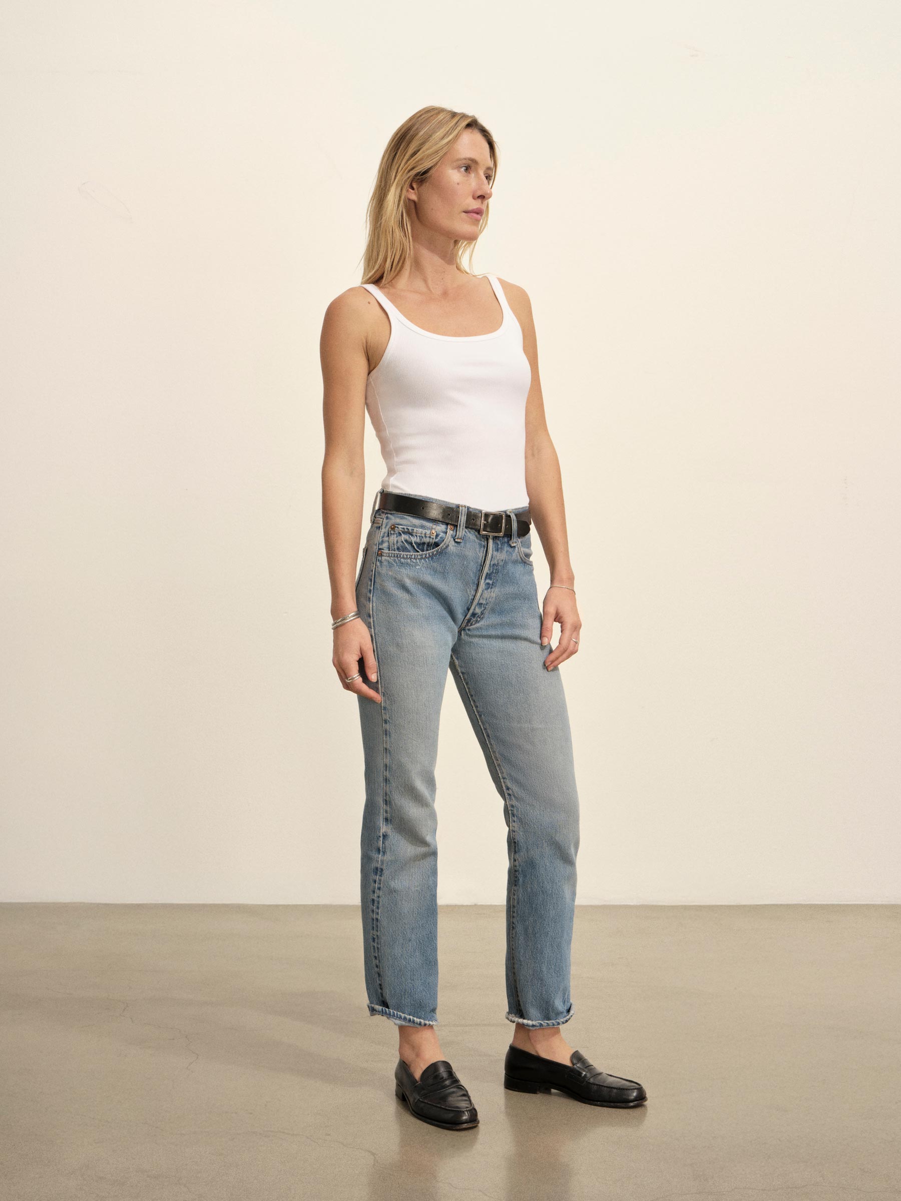 Slim fit ribbed scoop neck tank cut from 295 GSM stretch cotton that holds its shape. 2×2 rib structure—two rows of rib stitch, two rows of jersey stitch—is offset by contrast 1×1 rib at the neck. Constructed with coverstitching throughout and flatlock stitching at the side seams. Garment washed for a lived-in feel.