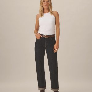 Slim fit, vintage military-inspired tank cut from 295 GSM stretch cotton that holds its shape. 2×2 rib structure—two rows of rib stitch, two rows of jersey stitch—is offset by contrast 1×1 ribbing at the neck. Features a hidden thread chain and snap at each shoulder to hold bra straps in place. Constructed with flatlock stitching throughout and double needle coverstitching at the hem. Garment washed for a lived-in feel.