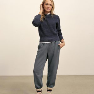 Straight leg, high-waisted 2×2 rib knit pant cut from 295 GSM stretch cotton that holds it shape. Fits comfortably at the waist with a wide elastic waistband with a full length inseam measuring 31 3/4”. Garment washed for a lived-in feel.