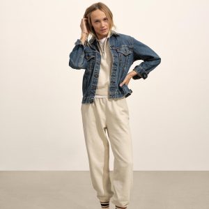 Oversized, quarter-zip sweatshirt that sits below the waist. Features an off-shoulder fit with rib-banded cuffs and hem.