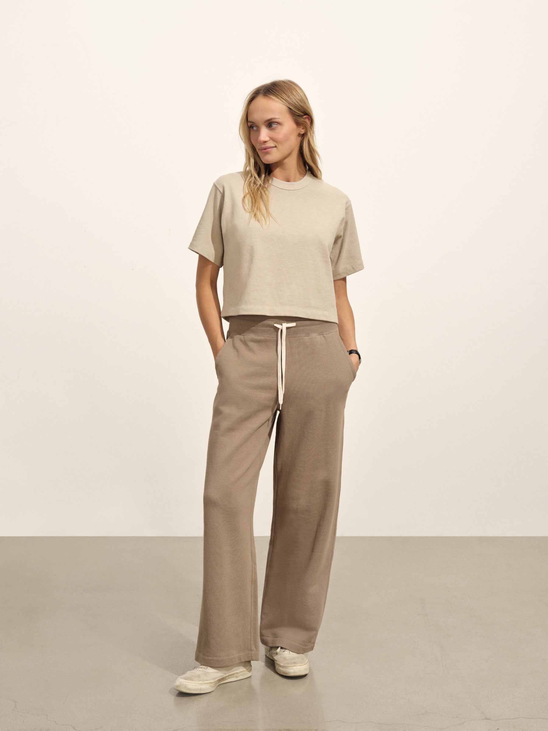 Wide leg, high-waisted sweatpants with a 28” inseam. Can be worn at the natural waist or lower for a more relaxed fit. Cut from 290 GSM cotton French terry with a semi-brushed back. Features a wide, ribbed waistband with drawcord for fit adjustments. Constructed with straddle stitching at seams for durability. Garment dyed and washed for a lived-in feel. Pair with our Vintage Overloop Crew.
