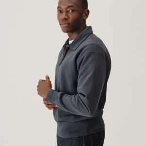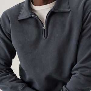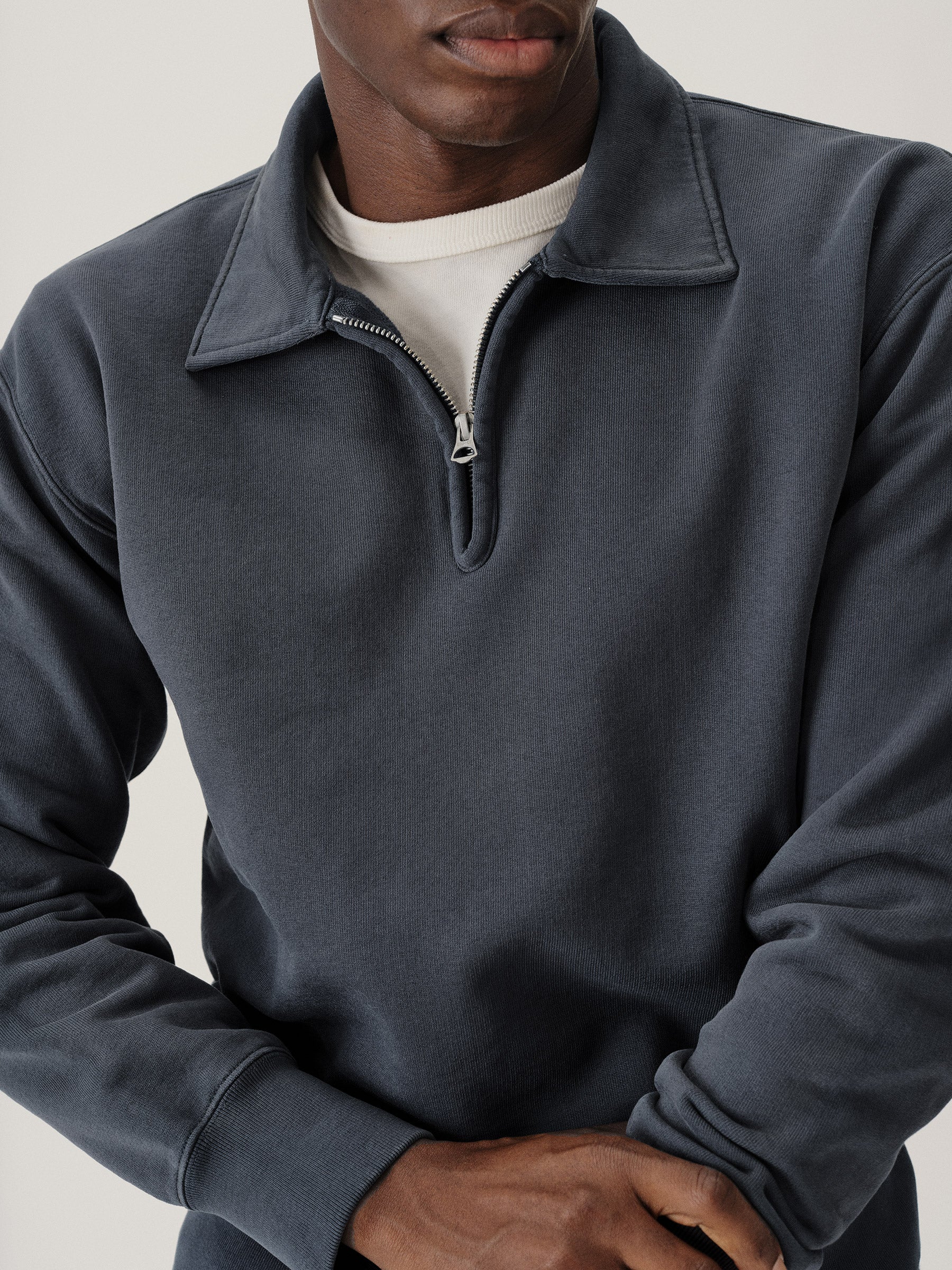 A midcentury-inspired quarter-zip collared sweatshirt made from plush, not-too-heavy, not-too-light, welterweight French terry. Features a foldover collar and front zip closure.